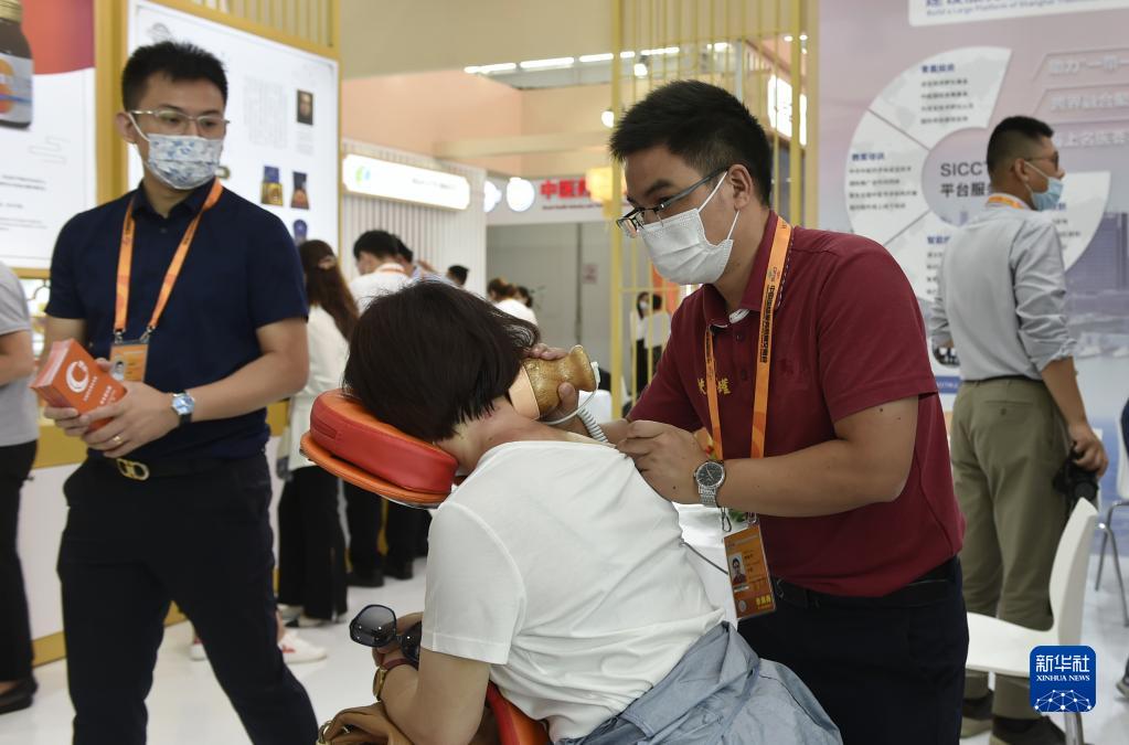 9月3日,在2021服贸会首钢园区的健康卫生服务专题展馆内,观众现场体验温灸磁疗罐的理疗效果。