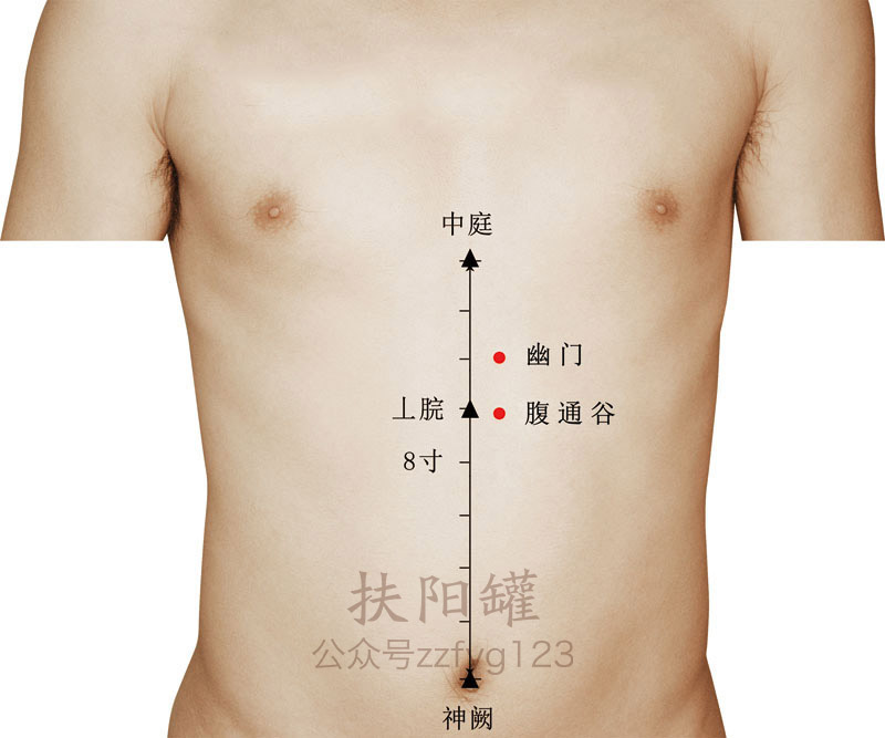 在上腹部,当脐中上6寸,前正中线旁开0.5寸。 -