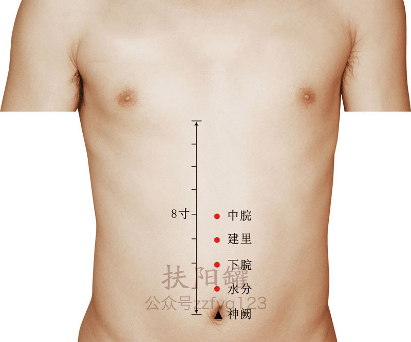 仰卧位或正坐位。从肚脐起沿腹部前正中线直上量4横指处,即为本穴。 -