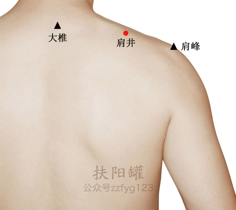 第5步:大椎与肩部最高点连线中点,前对乳中即为本穴。 -
