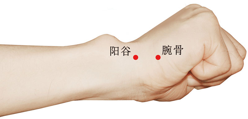 微握拳,掌心向胸。由后溪(参见“后溪”)向腕部推,可摸到两块骨头(第5掌骨基底与三角骨),在两骨的结合部、掌背面交界处可触及一凹陷处,即为本穴。 -