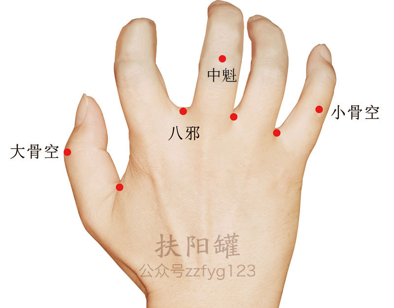 握拳,掌心向下。在中指背侧近侧指间关节的中点处。