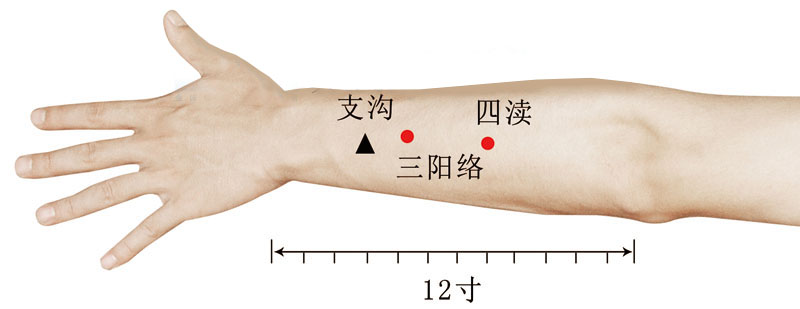 抬臂俯掌。从掌腕背横纹中点处直上量4横指即支沟(参见“支沟”),再从支沟直上量1横指,在前臂两骨头之间可触及一凹陷,按压有酸胀感,即为本穴。 -