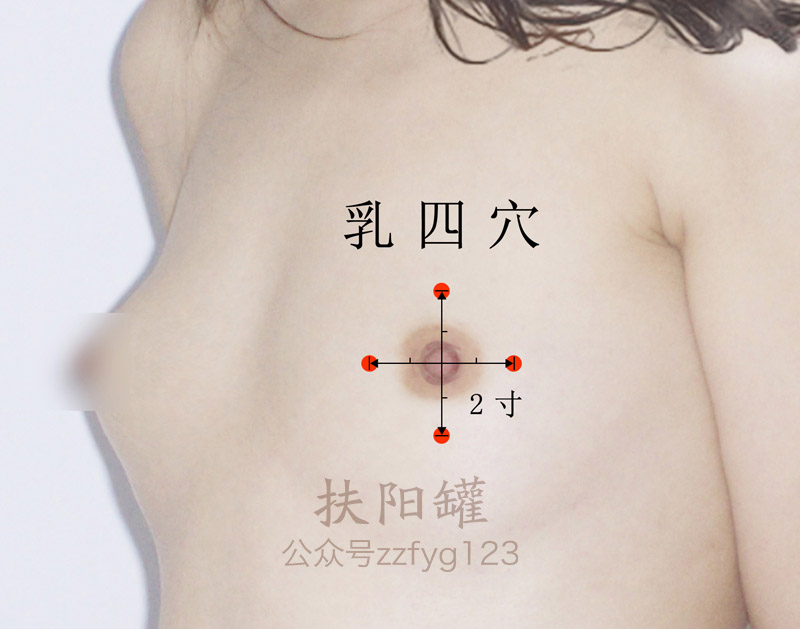 在以乳头为中心的垂直线和水平线上,分别距乳头2寸。