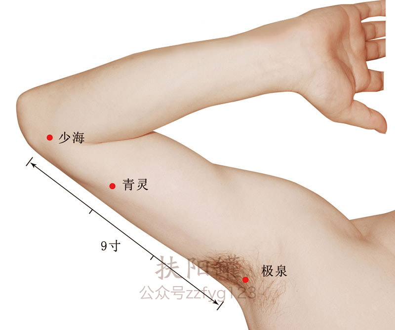 伸臂。先确定少海(参见“少海”)与极泉(参见“极泉”)的位置,从少海沿少海与极泉的连线向上量4横指,按压有酸胀感处,即为本穴。 -