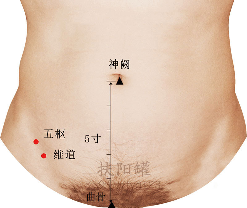 第5步:在骨盆的前上方可摸到一骨突起(即髂前上棘),该骨突起的前方和此线相交处,即为本穴。 -