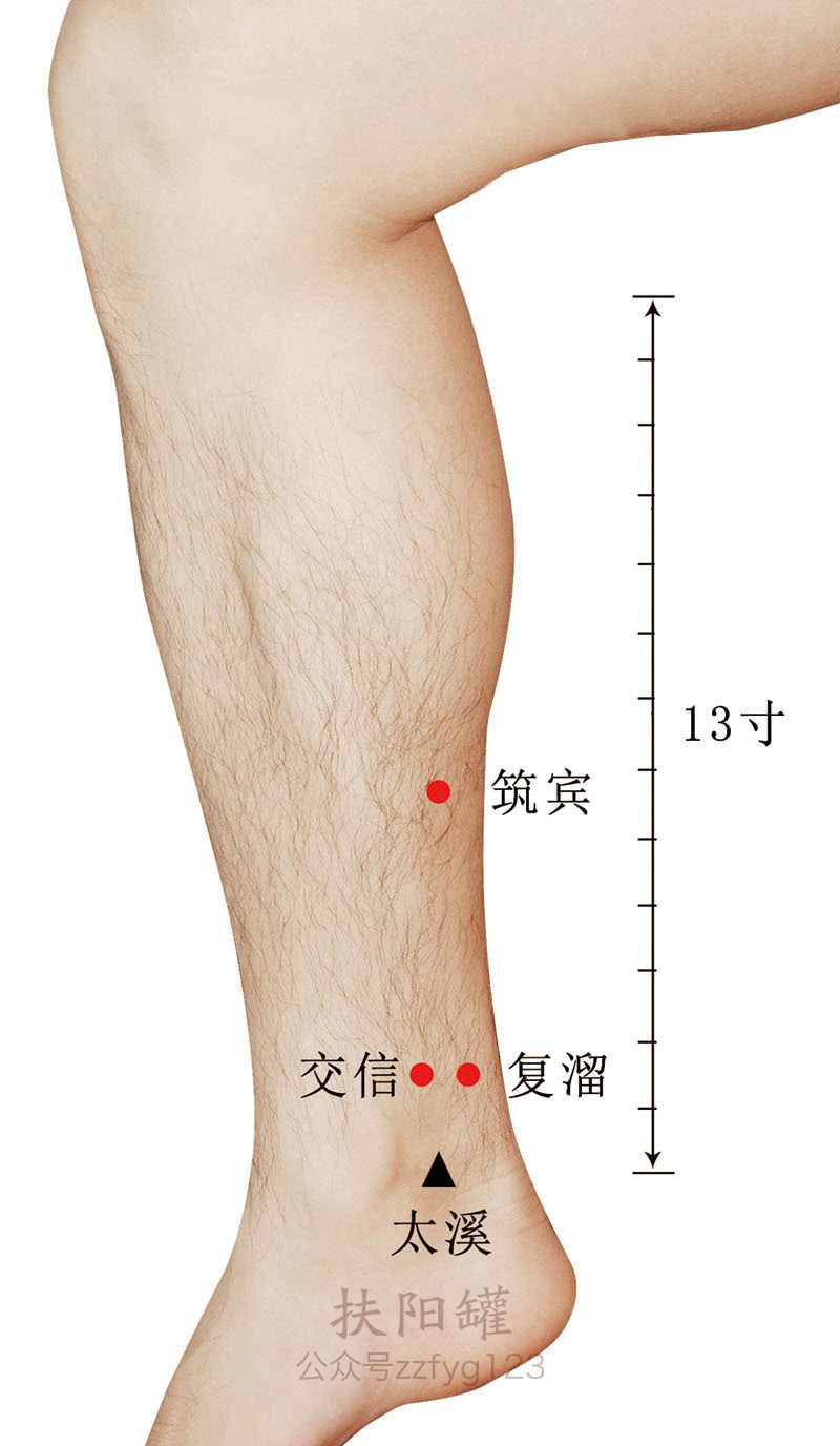 在小腿内侧,当太溪直上2寸,复溜前0.5寸,胫骨内侧缘的后方。 -