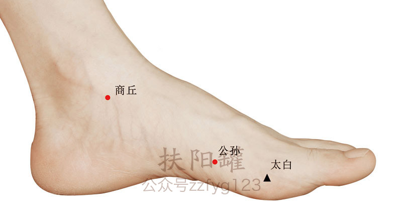 在足内侧缘,当第1跖骨基底部的前下方。 -