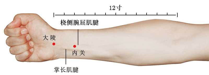 在前臂掌侧,当曲泽与大陵的连线上,腕横纹上2寸,掌长肌腱与桡侧腕屈肌腱之间。 -