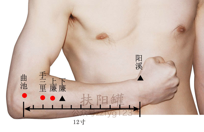 伸臂俯掌。先确定阳溪(参见“阳溪”)与曲池(参见“曲池”)的位置,从肘横纹沿阳溪与曲池的连线向下量4横指处,即为本穴。 -