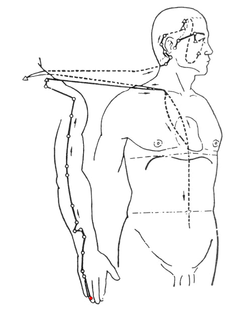 手少阳三焦经起于无名指末端(关冲),向上行于小指与无名指之间,沿着手背,出于前臂外侧桡骨和尺骨之间,向上通过肘尖,沿上臂外侧,上达肩部,交出足少阳经的后面,向上进入缺盆部,分布于胸中,散络于心包,向下通过横膈,从胸至腹,属上、中、下三焦。胸中支脉,从胸向上,出于缺盆部,上走颈旁,联系耳后,沿耳后直上,出于耳部上行额角,再屈而下行至面颊部,到达眼下部。耳部支脉,从耳后进入耳中,出走耳前,与前脉交叉于面颊部,到达目外眦(丝竹空),与足少阳胆经相接。