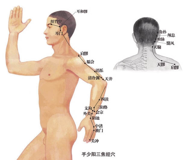 关冲用于急救和急性咽喉肿痛等;中渚调理耳疾;外关调理侧头、侧胸、上肢疾患和热病;支沟调理便秘;天井调理瘰疬;肩髎等肩周穴位调理肩臂部疼痛;翳风调理口?、耳鸣、耳聋;角孙调理侧头痛、颊肿;耳门以调理耳疾为主;丝竹空调理目疾。