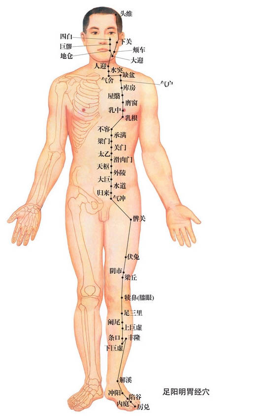 【附】《灵枢?经脉》:胃足阳明之脉,起于鼻,交頞中,旁约太阳之脉,下循鼻外,入上齿中,还出夹口,环唇,下交承浆,却循颐后下廉,出大迎,循颊车,上耳前,过客主人,循发际,至额颅。其支者:从大迎前,下人迎,循喉咙,入缺盆,下膈,属胃,络脾。其直者:从缺盆下乳内廉,下夹脐,入气街中。其支者:起于胃口,下循腹里,下至气街中而合。——以下髀关,抵伏兔,下膝髌中,下循胫外廉,下足跗,入中指内间。其支者,下膝三寸而别,下入中指外间。其支者:别跗上,入大指间,出其端。