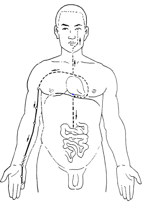 手少阴心经起于心中,属心系(心与各脏相连的组织)、络小肠;从心系联络咽、目系(眼后与脑相连的组织)和肺,从肺部浅出腋下(极泉),循行于上臂内侧后缘,于手太阴经和手厥阴经之后,经肘部和前臂内侧,至掌后豌豆骨部,入掌内,止于小指桡侧端(少冲)。