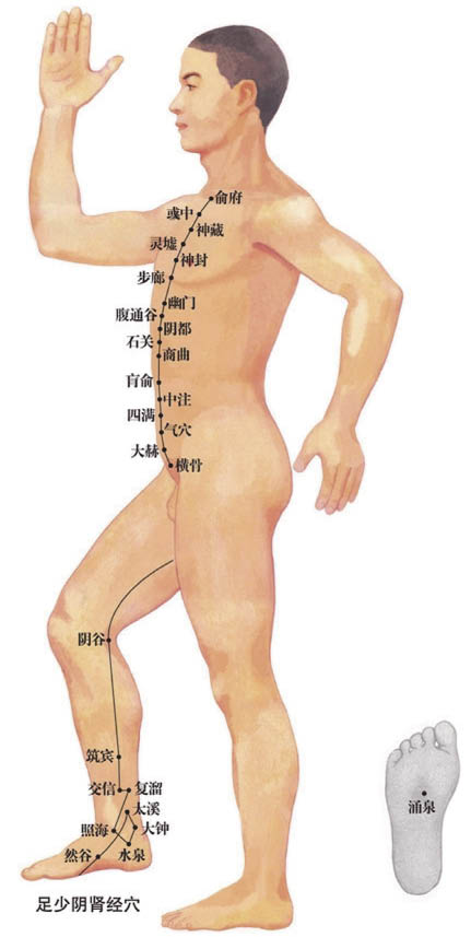 足少阴肾经起于足小趾之下,斜向足心(涌泉穴),出于舟骨粗隆下,沿内踝后,进入足跟,再上行于腿肚内侧,出腘窝内侧,向上行股内后缘,通向脊柱,属于肾,联络膀胱。其直行的支脉从肾向上通过肝和横膈,入肺中,循着喉咙,上夹舌本;其支脉从肺出来络心,注入胸中,与手厥阴心包经相交接。有一腧穴通路:行于腹部前正中线旁开0.5寸,胸部前正中线旁开2寸,终止于锁骨下缘(俞府)。